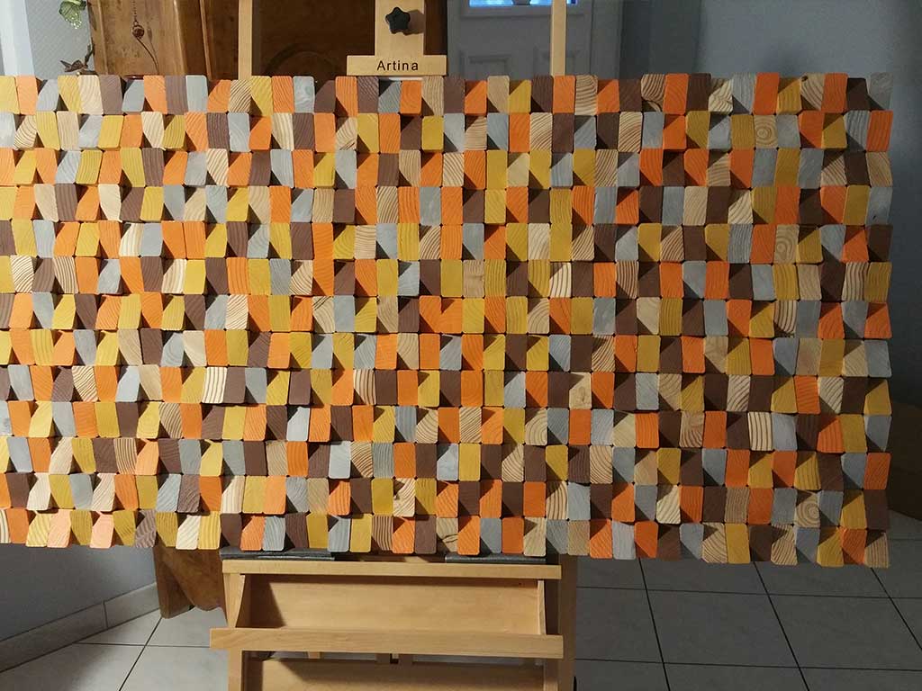En pin d'Oregon et Orme, finition vernis bio. Le modèle photographié mesure 74 x 145 cm. L'épaisseur du bois est d'environ 5 cm au relief. Entretien au chiffon doux. Les variantes de taille et d'orientation sont à votre souhait. La fixation est intégrée