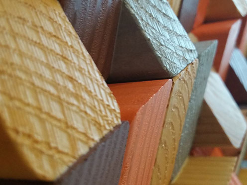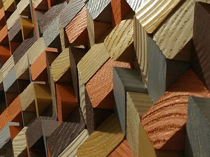 Ses éléments sont taillés de manière à laisser percevoir les veines naturelles du bois. L'aspect visuel change au gré de l'orientation du regard et de l'éclairage ambiant..