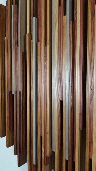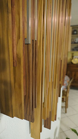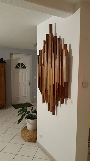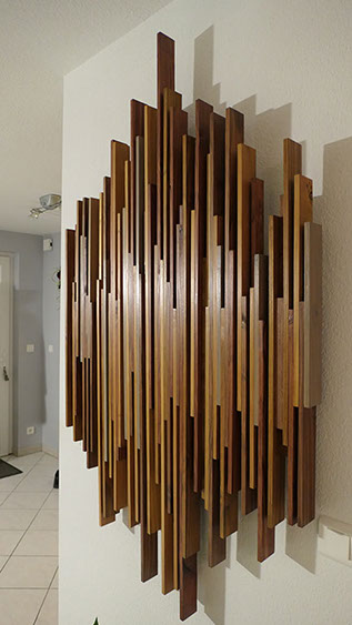 Les éléments s'alignent et se chevauchent. Ils s'harmonisent par leurs différences... leurs variations de dimensions et de couleurs. Soigneusement polie, sa texture est lisse en laissant paraître ce qui fait la vie et le charme du bois...