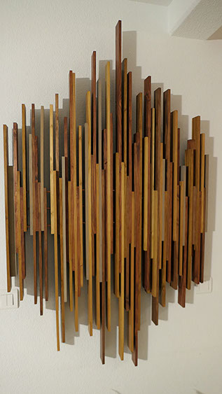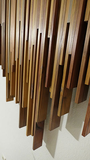 Les éléments s'alignent et se chevauchent. Ils s'harmonisent par leurs différences... leurs variations de dimensions et de couleurs. Soigneusement polie, sa texture est lisse en laissant paraître ce qui fait la vie et le charme du bois...